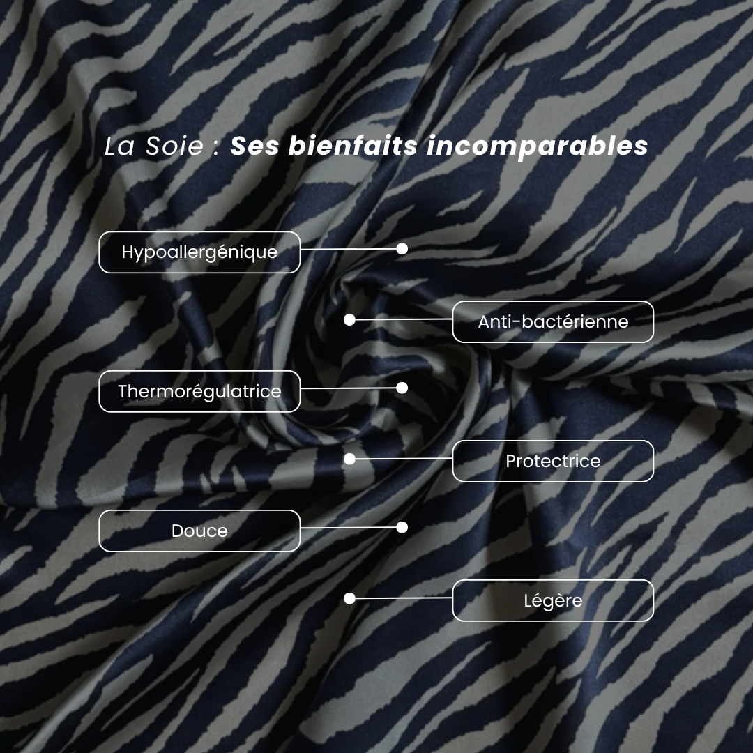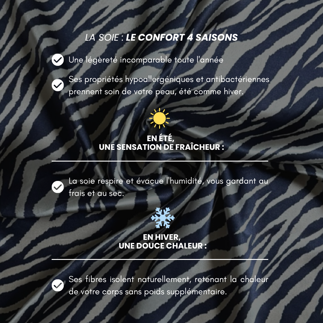 Naturellement thermorégulatrice, la soie est une matière qui apporte de la fraîcheur en été et qui maintient au chaud en hiver pour un confort en toutes saisons.
